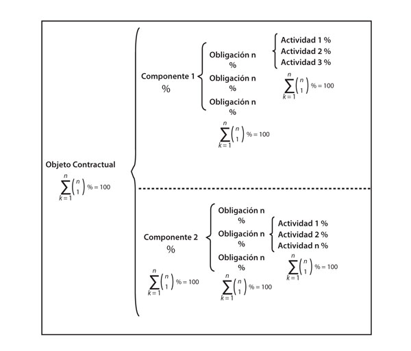 Se define de acuerdo con la relevancia que tiene cada una de las obligaciones específicas para el logro del componente. Para definir la importancia que tiene cada uno de los niveles al logro del objeto contractual, el contratista, según su estrategia de la ejecución, asigna un ponderador tanto a los componentes como a las obligaciones específicas. Una vez definidos los ponderadores, se discutirán con el contratante para que conjuntamente se acuerde el nivel de contribución al logro del objeto contractual.