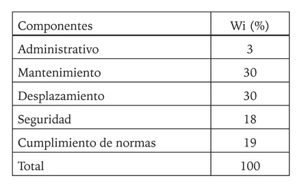 aj con J=1, ..., n, de modo que n es igual a 5 que corresponde al número de componentes en estudio y wi representa la relevancia de la j-ésima variable, es decir, el ponderador conforme a la calificación obtenida. Como se observa en la ecuación 1, cada razón aj se multiplica por su correspondiente relevancia wi.