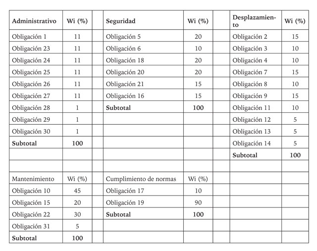 En nuestro caso de estudio, no todas las obligaciones tienen el mismo nivel de relevancia en los componentes misionales. Sin embargo, para el componente funcional, las obligaciones sí tienen el mismo nivel de contribución, lo que es lógico si se considera que son apoyo al funcionamiento del contrato (Tabla 5).