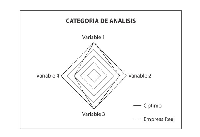El modelo gráfico utilizado define las categorías de análisis, como se ve en la figura 1, correspondiendo un gráfico a cada categoría. Así mismo, en cada vértice se encuentra una variable que favorece la competitividad, cuantificada de acuerdo con el análisis cualitativo llevado a cabo en cada empresa. En la figura del ejemplo, se tienen dos empresas: la primera, denominada «Óptimo» -representada por la línea continua-, describe unas puntuaciones ideales de cinco que representan la máxima competitividad en todas las variables de la categoría en cuestión, abarcando toda el área del rombo.