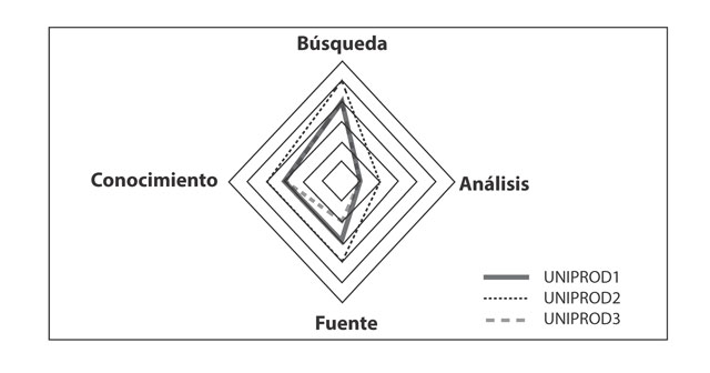 La categoría Vigilancia presenta coincidencias para las empresas UNIPROD1 y UNIPROD3 en tres de las cuatro variables de análisis. De manera que se obtiene un gráfico superpuesto para las dos empresas, con diferencia únicamente en la variable Fuente. La empresa UNIPROD2 tiene un área mayor en su gráfico, pues todas sus variables presentaron calificación superior frente a las otras dos empresas (figura 2). Esta empresa es más consciente de la necesidad de búsqueda de información de su entorno, y de conocer su competencia. Sin embargo, las tres firmas manifiestan no tener personal dedicado explícitamente a esta labor.