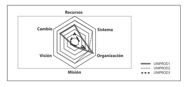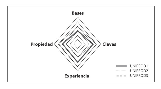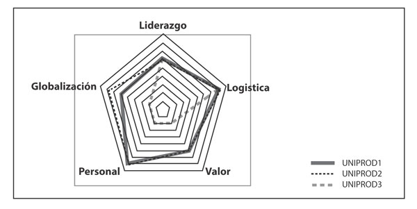 La comparación de las tres empresas con el uso del modelo deja ver que la empresa UNIPROD3 en las categorías analizadas siempre formaba los polígonos más pequeños, mientras que la empresa UNIPROD2 describe los polígonos de mayor tamaño. Esta evidencia empresarial es consistente con la premisa que señala que las empresas que se internacionalizan propenden a tener mayores desarrollos de sus potencialidades competitivas, frente a las empresas que se dedican a atender mercados locales. En un mundo cada vez más global, las empresas que se han dedicado solo a esto deben aprovechar sus oportunidades, orientar sus fortalezas y disminuir sus limitaciones so pena de ser castigadas por la competencia implacable del mercado.