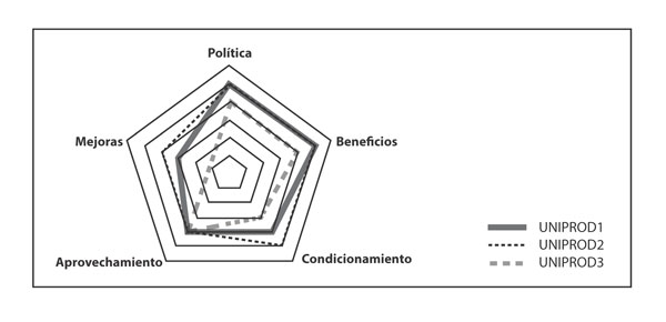 La Infraestructura, y sus cinco variables, presentan comportamientos diferentes en las tres empresas, y refleja la realidad sectorial. En las empresas que producen derivados lácteos, la política es adquirir maquinaria y tecnología que aumente la productividad y favorezca el crecimiento de la capacidad instalada, como lo refleja la empresa UNIPROD1. Los aspectos diferenciadores de los productos que exporta la empresa UNIPROD2 se evidencian en sus políticas tecnológicas, y demuestran que son conscientes de ello. La empresa UNIPROD3, en cambio, evidencia poco desarrollo en este aspecto, justificado por su bajo nivel de transformación del producto, lo que les ha exigido históricamente menor inversión en maquinaria y tecnología, pues la que tienen satisface sus necesidades actuales. Dicho nivel de «conformismo» se refleja en un atraso respecto del potencial competitivo relacionado con esta categoría de análisis y de la comparación con las otras dos empresas (figura 4).