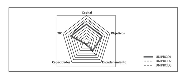 La aplicación del modelo a las empresas UNIPROD1, UNIPROD2 y UNIPROD3 se documenta de manera cualitativa y cuantitativa, para determinar su potencial competitivo. La descripción detallada de las variables de cada vértice en todas las categorías se encuentra en el anexo A. Se debe tener presente la descripción hecha en los pies de página.