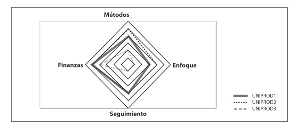 La Evaluación financiera es fundamental para la sostenibilidad de cualquier organización. Las empresas UNIPROD1 y UNIPROD2 realizan seguimiento constante a su información financiera y poseen un historial de resultados positivos. Sin embargo, muestran deficiencias en el uso de la información financiera como herramienta para la toma de decisiones -por eso la calificación más baja en la variable Enfoque-. Por su parte, la empresa UNIPROL)3 únicamente argumenta resultados financieros positivos; pero, analizando integralmente esta categoría, presenta potencial competitivo con grado de desarrollo muy inferior al de las otras empresas analizadas. Hay mucho por hacer en temas de seguimiento y uso de la información para diagnosticar y tomar decisiones (figura 6).