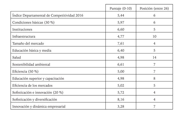 En el ranking departamental de competitividad de 2016 (tabla 1), Cundinamarca ocupa el sexto lugar, con puntaje de 5,44, mientras el mayor lo tiene Bogotá, con 8,18, habiendo obtenido el séptimo en 2014. Participa con el 5,06 % del PIB y tiene una población estimada de 2,72 millones de habitantes. Su mejor posición en el ranking es el cuarto lugar en los pilares de tamaño del mercado, y en innovación y en sofisticación. Sus peores posiciones en el ranking son el puesto 14 en salud, y el puesto 10 en infraestructura (Consejo Privado de Competitividad, 2016b, p. 72)