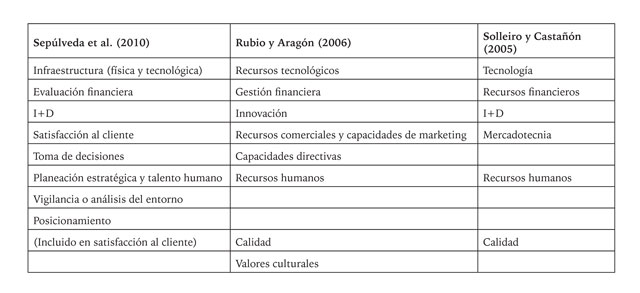 Para reconocer las categorías de análisis propuestas, se utilizaron otros modelos para medir competitividad en pymes, tras lo cual se encontró, por un lado, coincidencias del estudio cienciométrico con el análisis de Rubio y Aragón (2006), quienes analizaron los factores competitivos que explican el éxito en una pyme, y el número de autores que han citado cada una de las categorías. Por otro lado, también se encontraron puntos coincidentes con los análisis de Solleiro y Castañón (2005), quienes tomaron los factores internos empresariales que facilitan la innovación y la competitividad. Esta comparación puede observarse en la tabla comparativa de estos tres modelos (tabla 3).