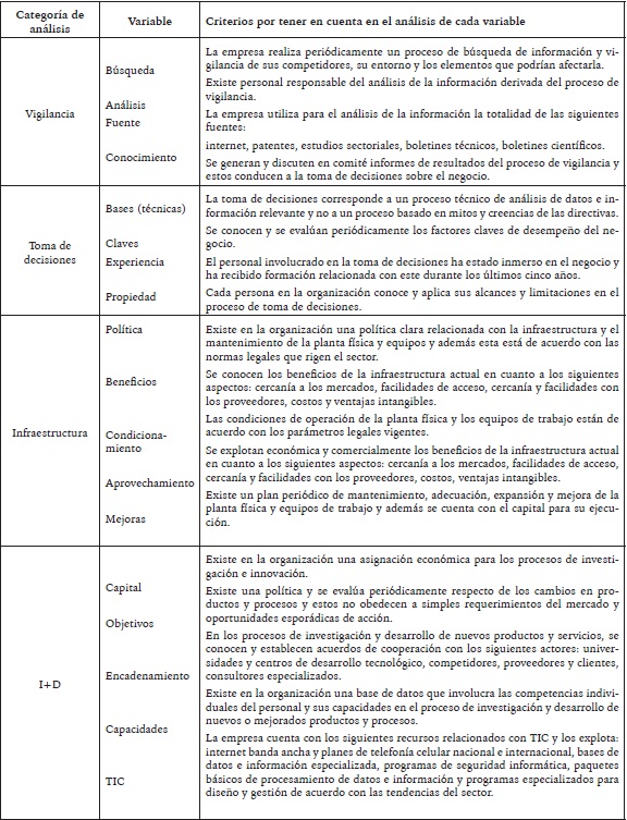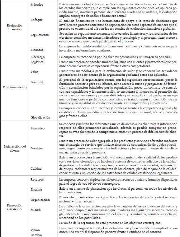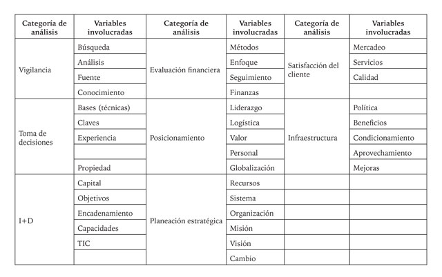 Las categorías de análisis fueron establecidas por Sepúlveda et al. (2010), a partir de un estudio cienciométrico realizado a 148 artículos científicos relacionados con el tema de competitividad. Los autores del modelo listaron los términos claves que coincidían en todos ellos y determinaron las intersecciones conceptuales con ayuda de algoritmos de mapas SOM.2 A través de mapas de concurrencias, es decir, palabras que aparecen de manera grupal en varios de los artículos analizados, los autores determinaron los términos más repetidos a la hora de hablar de competitividad. En este análisis, se estandarizaron, a través del análisis de puntos convergentes, las categorías de análisis utilizadas en esta investigación del grupo de empresas del sector agroindustrial de Ubaté.