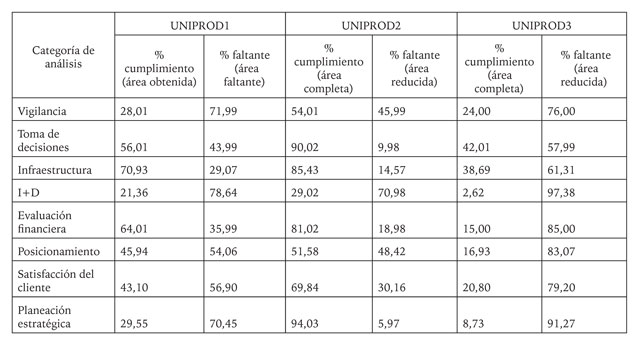 La aproximación cuantitativa permite vislumbrar con mayor claridad los niveles de competitividad en las categorías de análisis utilizadas. La sencillez del cálculo es valorado como uno de los aportes más importantes de la propuesta, puesto que permite a mipymes hacer diagnóstico de su potencial competitivo. La valoración numérica se concreta en las áreas de los polígonos resultantes del análisis cualitativo, las cuales se obtienen de sumar las áreas de los triángulos internos de cada gráfico. En la tabla 5, se expresan las áreas calculadas como porcentajes de cumplimiento y se restan del porcentaje óptimo mostrando también porcentajes de desarrollo faltante para cada una de las categorías de análisis. La empresa UNIPROD1 destaca su desarrollo en las categorías de Infraestructura (70,93 %), Evaluación financiera (64,01 %) y Toma de decisiones (56,01 %). Sus mayores oportunidades de mejora -desarrollo faltante del 78,64 %- se encuentran en la categoría I+D. La empresa UNIPROD2 es la que presenta los porcentajes de desarrollo más altos al analizar el conjunto de las categorías. Su mayor fortaleza está en la categoría Planeación estratégica, y las mayores oportunidades están en la categoría I+D. La empresa UNIPROD3 no presenta ninguna categoría con un grado de desarrollo superior al 43 %, lo que la posiciona como la de menor potencial competitivo de las tres. Su mayor fortaleza está en la categoría Toma de decisiones (42,01 %), pero debe trabajar bastante en aspectos de planeación, estrategia, innovación y uso de la información financiera para la toma decisiones.