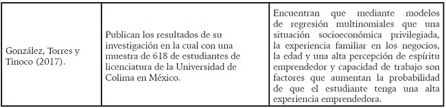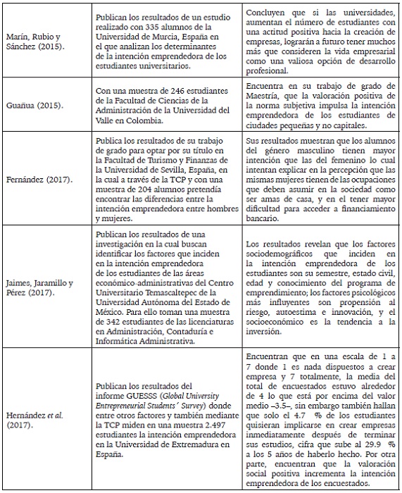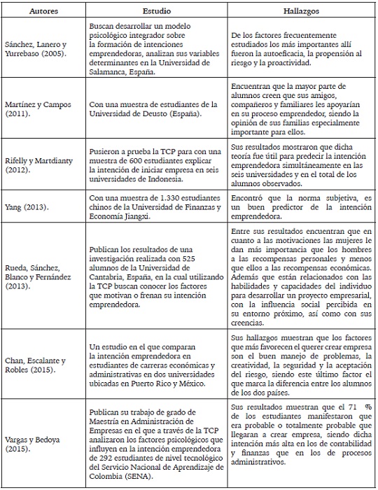 El segundo factor de la teoría de Ajzen (1991) es en el que profundiza esta investigación, tanto para conocer la valoración de la percepción que tiene la sociedad sobre la creación de empresas, como el impacto que ello tiene en su intención emprendedora. A continuación, se relacionan trabajos encontrados en relación con la teoría del Comportamiento Planificado, la norma subjetiva y la intención emprendedora, mismos que aportan elementos conceptuales o empíricos a la presente investigación (Tabla 1).