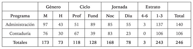 La tabla 2 permite ver que la muestra quedó constituida por 246 estudiantes, de los cuales 73 eran hombres -30 %- y 173 mujeres -70 %-, que 78 estaban en la jornada diurna -31 %- y 168 en la nocturna -69 %-, 118 cursaban el ciclo profesional -48 %- y 128 el de fundamentación -52 %-; y finalmente que 243 eran de estrato socioeconómico 1-3 -99 %- y el solo 3 de los estratos 4-6 -1 %-.