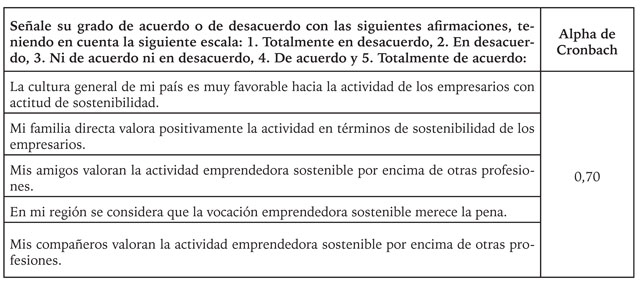 La tabla 3 muestra las preguntas que se formularon y las opciones que se utilizaron para conocer la percepción que tenían los estudiantes sobre la valoración social de la creación de empresas sostenibles, puede verse en el estadístico Alpha de Cronbach de 0,70 -cercano a 1- que la escala es fiable, es decir que mide adecuadamente la variable revisada (Mercado y Gil, 2012, p. 266).