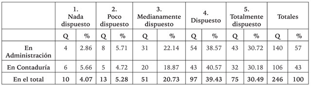 Para medir esta variable se preguntó a los estudiantes cuál era su disposición actual para crear una empresa sostenible propia, ofreciéndoles las siguientes alternativas: 1) Nada dispuesto; 2) Poco dispuesto; 3) Medianamente dispuesto; 4) Dispuesto y; 5) Totalmente dispuesto.