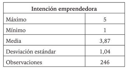 Por su parte, la tabla 5 indica que la media de la intención emprendedora en el total de alumnos encuestados es de 3.87, al acercarse al 4.0 señala que en general tienen buena disposición a crear empresa propia. Estos resultados coinciden con otros estudios realizados también en el país, como son los de Hernández et al. (2017), Buelvas et al. 2016 y los de Vargas y Bedoya (2015), ya que en todos la media es superior al valor intermedio de las escalas respectivas -de 1 a 5, o de 1 a 7 según el caso-.