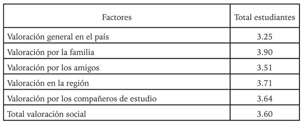 En la tabla 6 se muestra que para el global de estudiantes la calificación promedio de su percepción sobre la valoración que hace la sociedad sobre la creación de empresas sostenibles fue de 3.601, lo que indica que en general es moderadamente buena, siendo los factores con mejor percepción la valoración positiva de la familia directa con 3.90 y vocación emprendedora sostenible en su región con 3.71, y la que cuenta con peor percepción es la favorabilidad positiva de la cultura general de país con 3.25.