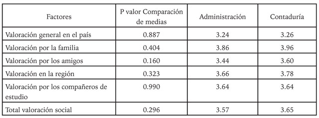 Al comparar por medio de la prueba T de Student, las medias de los factores de percepción social en los alumnos de contaduría frente a los de administración, se observa que en todos los casos son distintas, pero que estadísticamente ninguna de dichas diferencias es significativa (p>0,05), por lo que en esta investigación no se puede concluir que la carrera profesional tenga efectos sobre la intención emprendedora de los estudiantes (Tabla 7).