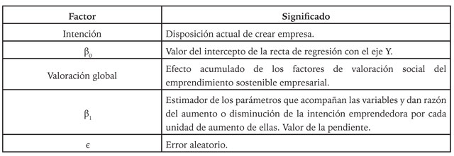 El siguiente es el modelo de regresión lineal utilizado para validar la hipótesis de este trabajo, es decir que cuanto mayor es en los estudiantes la percepción de una positiva valoración social respecto a la creación de empresas, mayor es su actitud emprendedora sostenible: