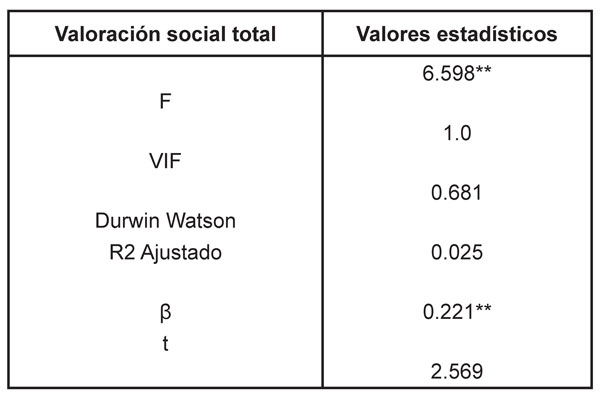 La tabla 9 muestra los resultados de la regresión lineal utilizada para determinar el impacto de la valoración total sobre la intención emprendedora sostenible de los alumnos abordados. Se aprecia que el valor de la F (6.598**) indica un buen ajuste general del modelo usado, que al ser el VIF (Factores de Inflación de la Varianza) 1.0 y el de prueba de Durwin Watson encontrarse por debajo de 1.66, se deduce que en los datos utilizados no hay problema de multicolinealidad ni independencia. De igual manera que un R2 del 0.025 señala que la varianza de la intención emprendedora se explica en un 2.5 % por la valoración social que se hace de ella.