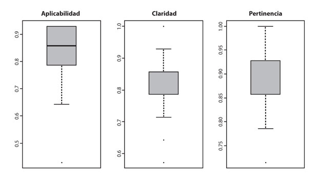 Para conocer gráficamente el nivel global de aceptación por constructo se presenta el gráfico de box-plot (figura 1). Esta permite identificar que los valores entre los cuales se encuentra la caja corresponden al 50 % de respuestas que se encuentran alrededor de la mediana. La proporción de los mejores niveles de aceptación es superior al 78 % para los 3 constructos medidos: aplicabilidad, claridad y pertinencia. El constructo mejor calificado fue pertinencia, donde el 75 % de los ítems tuvo niveles de aceptación entre 0.86 y 1.