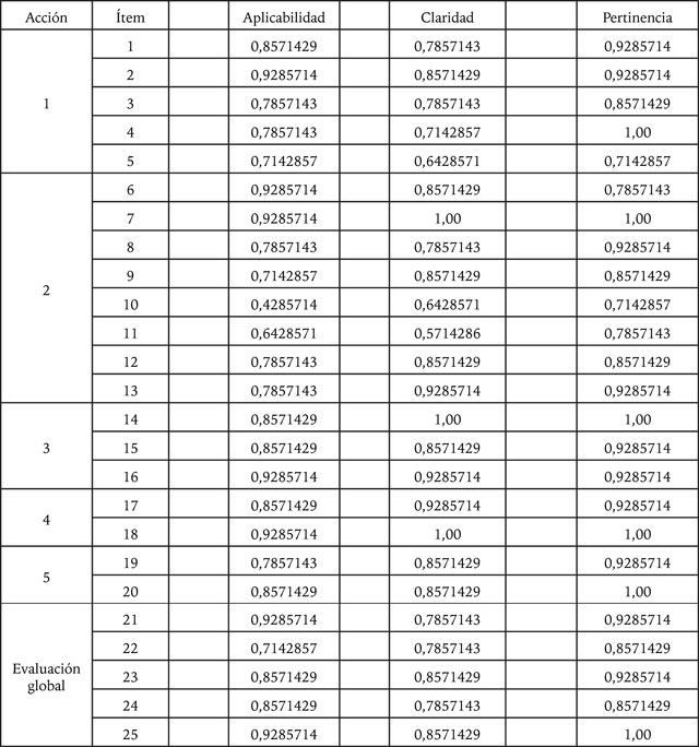 La correspondencia de los ítems evaluados en la validación de contenido es consistente con los datos requeridos para cada una de las acciones, así el ítem 1 corresponde al componente a) de la acción 1 descrito en la sección de resultados 3.1 y continua para cada una de las acciones. Para el caso de la evaluación global, los ítems pertenecen a cada una de las 5 acciones propuestas.