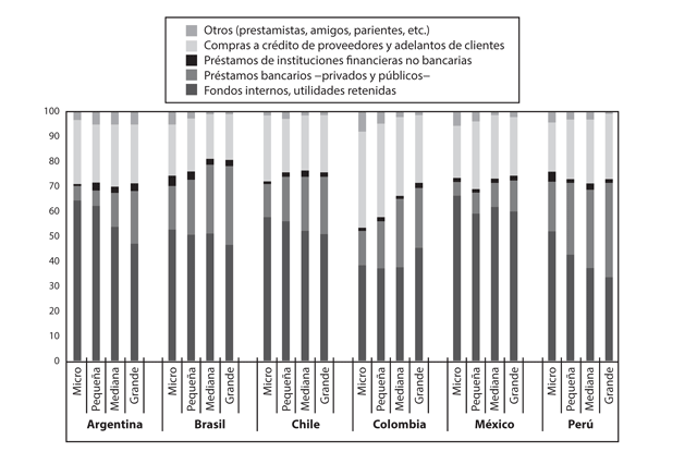 En la figura 2, se presenta un comparativo de las preferencias de financiación para el capital de trabajo, según el tipo de empresa y el país; en esta se evidencia que los fondos internos, a través de las utilidades retenidas, representan la primera opción para las pymes, seguido de las compras de crédito a proveedores y los préstamos bancarios, tonto públicos como privados. Así mismo, se evidencia que los préstamos de instituciones financieras no bancarias, representan la última opción como fuente de financiación para los países señalados en la figura (OCDE-ECLAC, 2012).
