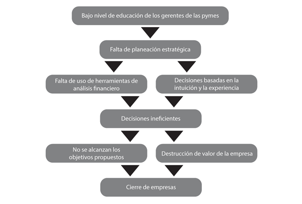 Ahora bien, se ha evidenciado que este tipo de empresas no logra permanecer en el mercado por mucho tiempo, debido a sus altas tasas de mortalidad, en las que el 80 % de las pymes no logra superar los dos años (Raufflet et al., 2012); ya que en el desarrollo de sus actividades enfrentan diferentes retos, para los cuales no muchas están preparadas y, por tanto, se ocasiona el cierre de estas, trayendo consigo una escasez de empleos y un declive en la economía.