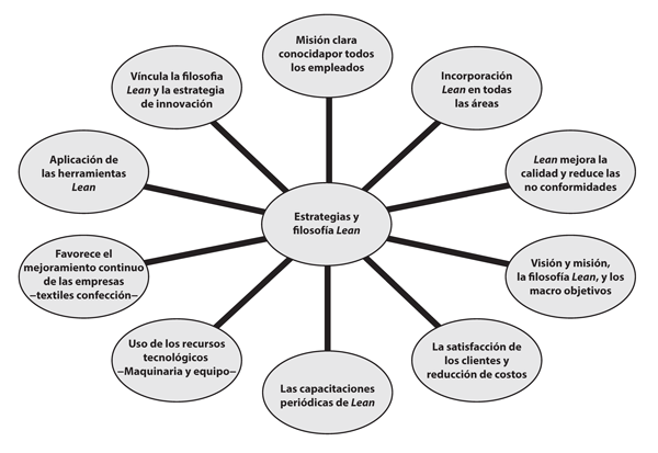 En la figura 1 se observan la interrelaciones entre las estrategias y la filosofía Lean, con aspectos claves identificados como resultado de la investigación realizada en todos los componentes del modelo Lean: misión clara y conocida por los empleados, incorporación Lean a todas las áreas, LM como mejora de la calidad y reducción de las no conformidades; la misión, la filosofía Lean y los macro objetivos; la satisfacción de los clientes y la reducción de costos, uso de los recursos tecnológicos, favorecer el mejoramiento continuo de las empresas, aplicación de las herramientas Lean, vinculación de la filosofía Lean y la estrategia de la innovación.