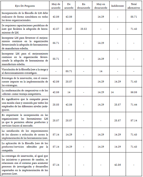 Resulta relevante señalar que para el 42.86 % de las organizaciones consultadas la estrategia de innovación adelantada en sus operaciones, no se fundamenta en la adopción de herramientas de LM. Dicha estrategia innovadora se centra en componentes externos a la organización, como lo son características y requerimientos del mercado. De aquí que el 28.57 % de los líderes, no posean una actitud muy favorable con respecto a que las herramientas de LM permitan ofertar productos y servicios únicos al mercado.