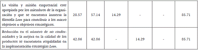 Ahora bien, la calidad se destaca como uno de los objetivos estratégicos más relevantes en la incorporación de LM. Es así como esta última posee una correlación significativa en la mejora en la calidad de los productos y servicios ofertados, lo que repercute en la satisfacción eficiente de las necesidades del consumidor. Además, la calidad también se refleja en los procesos internos, de forma especial en la reducción de mudas, desperdicios y no conformidades (tabla 3).