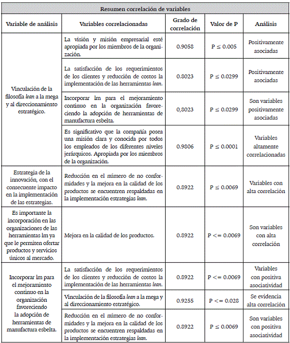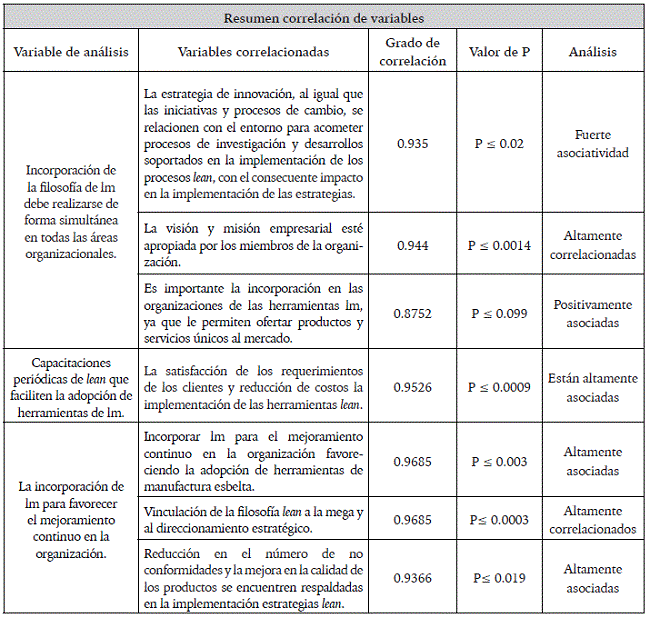 Se aprecia en los resultados que la mayoría de variables de análisis presentan un alto o fuerte grado de asociatividad o correlación -términos que para el presente estudio deben tomarse como sinónimos-, sin embargo, dos resultados de la tabla tienen un grado de correlación levemente inferior al promedio anterior -valor de la correlación mayor a 0.80 con P < 0.05-, por lo que en la valoración hecha en el análisis se catalogaron como positivamente asociadas.