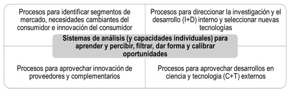 La exploración se entiende como la capacidad para adquirir conocimiento, por tanto, contempla rutinas para observar y monitorear cambios en el entorno cercano e identificar oportunidades (Ellonen, Jantunen y Kuivalainen, 2011; Morales-Rubiano, Ortiz-Riaga, Duque-Orozco y Plata-Pacheco 2016). Se configura a través del acceso a fuentes de información, de los procesos para identificar necesidades del cliente, del acceso a nuevas tecnologías y del desarrollo de conocimiento con empresas complementarias y proveedores (Teece, 2009). Este autor propone cuatro procesos ligados a la generación de capacidades organizacionales y sistemáticas (Figura 1).