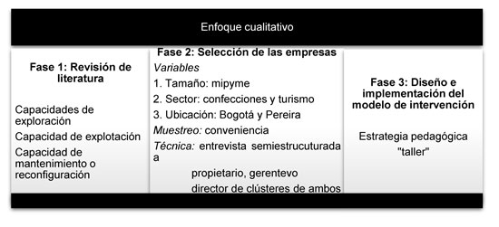 La metodología desarrollada para el fortalecimiento de capacidades para la innovación surtió tres fases: a) revisión de literatura que permitió definir como base para el diseño tres capacidades dinámicas -capacidad de exploración, capacidad de explotación y capacidad de mantenimiento-, b) selección de las empresas con muestreo a conveniencia y c) diseño e implementación de la metodología propuesta basada en la estrategia pedagógica de «taller».