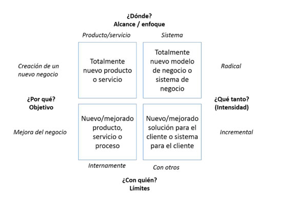 La capacidad de explotación se hizo nuevamente desde el planteamiento de Teece (2009), que se definió como las acciones necesarias para el desarrollo de productos o servicios y procesos que surgen a partir de la identificación de oportunidades. En este momento, se propusieron dos herramientas que le permitieran al empresario tomar decisiones. La primera parte de cuatro preguntas, dónde implementar innovación (Deschamps, 2005; Morales et al., 2016): a) ¿dónde innovar? que define el alcance y el foco que puede estar en productos/servicios o procesos; b) ¿por qué innovar? que implica establecer el objetivo de la innovación y crear un nuevo negocio o reforzar el actual; c) ¿qué tanto innovar? que permite determinar la intensidad, radical o incremental y establecer los límites del desarrollo; y d) ¿con quién innovar?, es decir, quienes participan del desarrollo, internamente o con aliados externos (Figura 5).