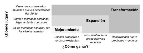 Así mismo, se trabajó una segunda herramienta a partir de la matriz dónde jugar/cómo ganar (Figura 6) que permite al empresario organizar las oportunidades identificadas de acuerdo con su alcance, para luego elegir portafolios de inversión; las empresas más innovadoras invierten un mayor porcentaje de sus recursos en los cuadrantes donde se crean mercados, nuevos productos o nuevos recursos/procesos; las empresas más conservadoras invertirán una mayor cantidad en actividades de mejoramiento en su actual mercado con sus actuales productos, recursos y procesos (Morales et al., 2016; Nagji y Tuff, 2012). Finalmente, lo que busca esta matriz es gestionar fondos de inversión mezclados donde se destinen recursos hacia los tres panoramas: mejoramiento, expansión y transformación (Figura 6).
