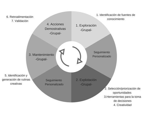De acuerdo con los objetivos específicos de la fase de implementación del modelo de intervención, y en relación con el desarrollo de las capacidades propuestas, es necesario trabajar el reconocimiento de fuentes de conocimiento externas a la empresa y especialmente las que tienen como origen la investigación, que permitan buscar ventajas competidas. Así mismo, es clave establecer los recursos y las capacidades de cada mipyme para saber el alcance que pueden llegar a tener en la explotación de oportunidades y en la generación de cultura de la innovación.