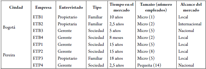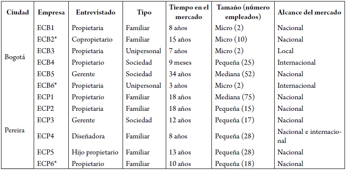 En Colombia, el sector turismo está compuesto por más de 13 000 empresas representadas en un 49,79 % por servicios de alojamiento y hospedaje, y un 2,58 % por agencias de viaje (Confecámaras, 2013), mientras que el sector confecciones está compuesto por 30 000 empresas, agrupadas en un 70 % en confección, manufactura y comercio (Colombia productiva, 2012) lo que dimensiona la importancia de estos dos tipos de organizaciones para el sector. Finalmente, la selección de empresas se llevó a cabo en Bogotá y Pereira, ciudades estratégicas para los dos sectores mencionados.