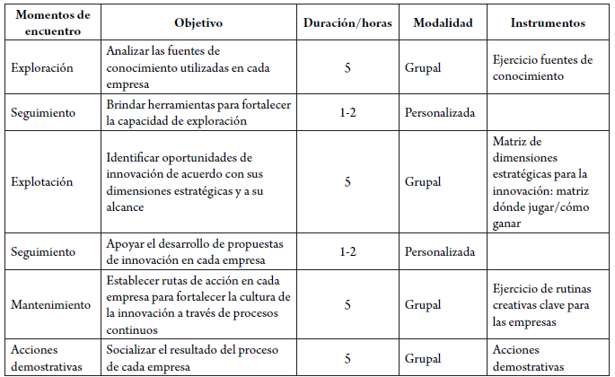 En concordancia con lo anterior, se estructuró el taller para fortalecer capacidades de innovación considerando los siguientes criterios: ciudad donde se adelantaría el proceso, experiencia de los participantes, cantidad de empleados que conformaba cada una de las empresas convocadas, capacidad para la toma de decisiones de quienes asistirían y nivel de desarrollo empresarial de las organizaciones. En este orden de ideas, el taller se organizó en cuatro momentos de encuentro grupales presenciales, con una duración aproximada de cinco horas cada uno, y dos seguimientos personalizados, con duración de una a dos horas (tabla 3).