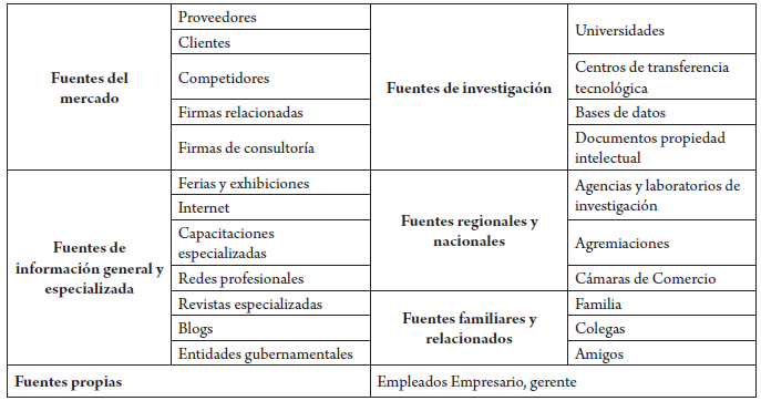 Se partió del planteamiento de Teece (2009) que hace énfasis en interpretar la información disponible para acumular, filtrar, procesar y generar hipótesis frente a las oportunidades y amenazas del mercado, aclarando que dicha información puede provenir de los clientes, los proveedores, las instituciones educativas, entre otros. En este primer momento, se tomaron las fuentes de información o conocimiento como eje central, dada su importancia para el trabajo empresarial innovador (Tabla 4).