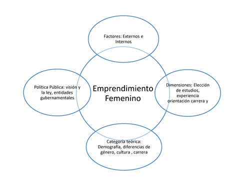 Castiblanco-Moreno (2013) revisa el surgimiento del emprendimiento como categoría teórica y su relación con los emprendimientos realizados por mujeres, e identifica cuatro elementos: características sociodemográficas de las mujeres que realizan emprendimientos, hallazgo de estudios acerca de las diferencias entre emprendimientos de hombres y mujeres, entendimiento y análisis de cómo la definición cultural del género desempeña un papel primordial en la decisión de emprender y recopilación de trabajos que abordan el emprendimiento como proceso vital en la redefinición de género. Un último eje, pero no menos importante, es la política pública que no se aborda específicamente desde el género, pero que sí influye notoriamente en los apoyos del Estado frente a las mujeres y la familia, la reducción de la pobreza y equidad. Así es como Tarapuez-Chamorro, Osorio-Ceballos y Botero-Villa (2013) abordan el enfoque en la política pública: para generar una política de emprendimiento, no es condición previa contar con una ley o documento que la impulse, sino con voluntad política y visión clara de lo que se persigue por parte de los actores involucrados, y las entidades gubernamentales que lideran su diseño y ejecución, al igual que sus directivos, deben contar al menos con amplia credibilidad, experiencia y estabilidad.