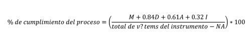 La aplicación de los instrumentos se realizó durante cuatro semanas, con la ayuda de estudiantes de Ingeniería Industrial, que fueron capacitados para esta actividad, y después de la generación de un plan de visitas que indicaba una ruta específica para aprovechamiento de recursos. Los datos obtenidos se procesaron desde el punto de vista de las brechas, es decir, porcentajes de cumplimiento respecto de los ideales, a partir del cálculo de la media de cada sección evaluada por proceso. Así mismo, el nivel de madurez de cada proceso se determinó utilizando la siguiente fórmula (donde M-D-A-l es la suma de las respuestas calificadas en cada nivel: M = Maduro, D = Desarrollo, A = Artesanal e I = Incipiente, mientras que NA es la suma de los ítems que no aplican al caso de estudio). Por último, se determinó el nivel de madurez por tipo de proceso y a nivel organizacional, a partir del cálculo de la media de los procesos dentro de la categoría.