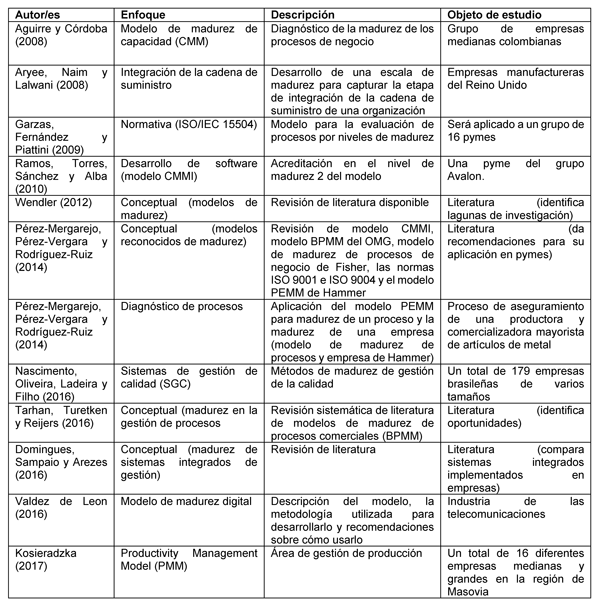 Díaz-Jaimes y Ortiz-Pimiento (2012) identificaron que son pocos los modelos existentes para empresas de manufactura, y que existe la posibilidad de construir nuevos modelos con el enfoque de la gestión de la cadena de suministro. Por su parte, Tarhan, Turetken y Reijers (2016) estudian el estado de la investigación sobre los modelos de madurez de procesos comerciales (business process management maturity [BPMM]) y concluyen que el estado actual de la investigación sobre la madurez de tecnología y gestión empresarial (business process management [BPM]) está en sus primeras fases y que la literatura académica carece de aplicaciones metódicas de muchos BPMM principales que se han propuesto.