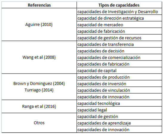 Existen diferentes tipos de capacidades analizadas en profundidad en Aguirre-Ramírez (2010), Argote-Cusi (2016, 2017) y Domínguez y Brown (2004), entre otros, como se puede ver en forma resumida en la tabla 1. De entre el bagaje de capacidades, las capacidades tecnológicas de innovación se consideran estratégicas en un contexto de grandes y acelerados cambios tecnológicos (Aguirre-Ramírez, 2010). Es en este sentido que la identificación y posterior fortalecimiento de las capacidades tecnológicas de las instituciones toma importancia para ser estudiada en diferentes instituciones privadas y públicas como la Esjim (Katz, 2007).