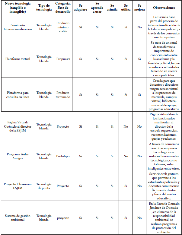 De acuerdo con la tipología desarrollada por Thompson en 1967 existen diferentes tipos de clasificación de la tecnología de acuerdo con su grado de obsolescencia, adaptabilidad, flexibilidad y el área en la que se desarrolla. Siguiendo algunas actualizaciones de la anterior tipología, en esta investigación se tomaron tres tipos de tecnología que se adecúan a la naturaleza y objeto social de la Esjim: la tecnología dura que está relacionada con la transformación de materiales, materias primas y objetos tangibles; la tecnología de punta que alude a los últimos avances, mejoras, descubrimientos y desarrollos tecnológicos en cualquier área; y la tecnología blanda asociada al desarrollo de conocimiento intangible que regularmente se plasma en la generación de software, metodologías, nuevas técnicas y modelos de aprendizaje (Shirazi, Mohammadi, Abbasi y Nazari, 2016).