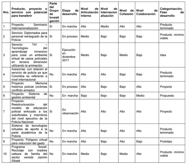La matriz de la tabla 2 tuvo como propósito identificar tanto las posibles tecnologías desarrolladas por la Esjim como la fase de desarrollo en la que se encontraba el producto para ser transferido. Dicha matriz fue complementada con la tabla 2 en la que se buscó identificar tanto los diferentes actores clave que intervinieron en cada iniciativa como el nivel de articulación interna, internacionalización y cohesión de los investigadores involucrados con el resto de ESJIM, aliados internacionales y su propio grupo de investigación.