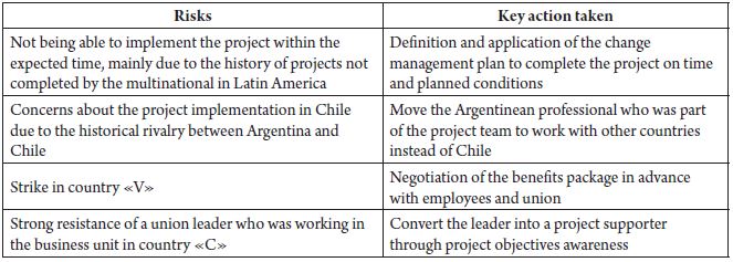 By adopting the change management plan, it was expected to minimize risks from a human perspective that could have negative impacts on the project implementation. Among positive qualitative results, shown in table 1, appears the early identification of the risk of a strike from company employees in country «V», which was avoided by the early negotiation of dismissal packages supported by the workers' local union. This action was possible by the fact that the project's team visited the country before the beginning of the transition phase and thus, identified and solved the risk in advance. Another positive result was obtained in country «C», where change management actions have transformed a strong union movement leader into a project advocate, by raising awareness of the benefits to the company and consequently to employees. In this case, this risk was identified well in advance, in a roundtable discussion with company employees.
