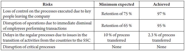 Under the quantitative perspective, results are in Table 2. One of them was the retention of 97 % of the key people by the end of the project, which gave the project great accuracy and stability of the processes transferred to the SSC. This result was achieved because virtually, all the key people knowing how to perform the tasks transferred to the SSC, remained in the company remotely, supporting the new operators until they had learned to execute the transactions. Another significant number that contributed to the stabilization of the operation in the SSC was the voluntary stay of fired employees. Until the end of the transition process in each country, 95 % of the employees who had their contracts terminated after the implementation of the project, remained in local operations up to the end of the project. Finally, from the approximately 1,000 processes transferred to the SSC, only 2.3 % started late, comparing to the planned period or presented processing errors in the first week of operation, none of which was considered a critical process.