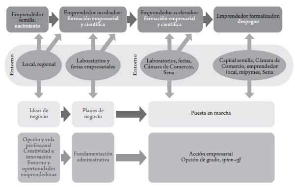 En la figura 1 se ilustra el proceso de desarrollo del emprendimiento dinámico, el cual, por lo general, pasa por los tres estados básicos: ideas de negocios, planes de negocios y puesta en marcha. Cada uno de estos estados tiene sus particularidades: en la idea de negocios se ubica el emprendedor semilla, con base en el entorno local, regional y con estudiantes, en busca de oportunidades emprendedoras; en los planes de negocios, básicamente se ubica la incubación con formación empresarial y científica -toda la fundamentación administrativa y los planes de negocios, la cual continúa con el proceso de aceleración en escenarios empresariales e institucionales, como, por ejemplo, el Centro de Emprendimiento, el SENA, la Cámara de Comercio, etc.-; y, finalmente, la puesta en marcha que se concreta en la formalización y el despegue de la empresa, valga decir, la acción empresarial, para lo cual son productos propicios las opciones de grado y las spin off.