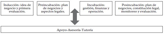 La figura 3 ilustra los procesos de incubación de negocios. Es necesario advertir que en todo el proceso se realiza apoyo, asesoría y tutoría. En este orden de ideas, el proceso presenta cuatro etapas: