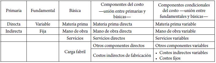 Cada caracterización de costos establece una clasificación taxonómica. La división primaria del inventario de producto en proceso contiene los costos directos e indirectos, y otra división fundamental es costos variables y fijos. La división básica se encuentra representada en los elementos del costo: materiales, mano de obra, servicios externalizados y carga fabril2. Estas tres divisiones de estructuras son isomorfas3 y cada una de ellas es igual pero distinta internamente, así como todas sirven para el análisis del proceso productivo. De esta manera se pueden realizar asociaciones entre categorías, lo que determina otros ordenamientos analíticos, como, por ejemplo, componentes del costo entre los que se encuentran materiales directos, mano de obra directa, servicios externalizados directos y costos indirectos de fabricación. Este es otro modelo isomorfo de los egresos de costo que asocia la caracterización primaria y la básica. Otra asociación factible es la unión entre la división fundamental y la básica que realiza una discriminación de componentes condicionales: materia prima variable, mano de obra variable, servicios variables y costos fijos. La clasificación de los componentes del costo y los condicionales no son iguales (véase la tabla 1), y cada una sirve para análisis específicos. De igual forma, el valor de sus categorías es distinto, así la sumatoria total sea la misma.