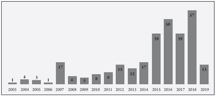 Figure 2 shows the trend in scientific production related to city marketing. It can be seen that, as of 2015, scientific production related to this subject has increased considerably. It can also be seen that the first scientific publication in this field is recorded in 2003, indicating that it is a relatively recent discipline. It should be noted that no conclusive data are presented as of 2019, year of this research.